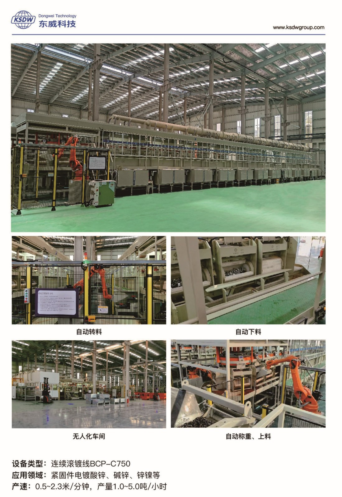 連續滾鍍線,全線環形水平傳動機構,使用東威獨有的開放式滾筒,實現高速、高穩定,大批量生產。自動化上下料,安全、節能、環保、高標準、智能化生產,可實現“黑燈工廠”。0.3-0.5小時,實現高品質5~8μm鍍層,全線噸級產品產出量,產品在鍍槽18-30分鐘時間完成電鍍;降低產品在電鍍階段氫脆風險,減少產品長時間大重量的磨損、磕碰;產品鍍層均勻性大幅度提升,化學品和電能的大幅節省。