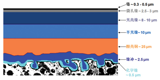 → 酸浸 → 水洗 → 半光鎳 → 光亮鎳 → 水洗 → 酸洗 → 水洗 → 沙丁鎳 → 水洗 → 微孔鎳