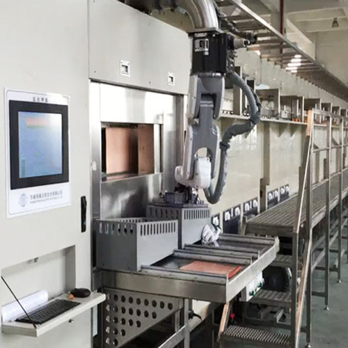 FPC機械手全自動上下料,無需輔助冶具;板面平整、運行穩定性高;垂直方向固定尺寸,電鍍均勻性高;垂直連續電鍍,產能大&灌孔率高;傳動導軌及夾具裝置自主專利設計。